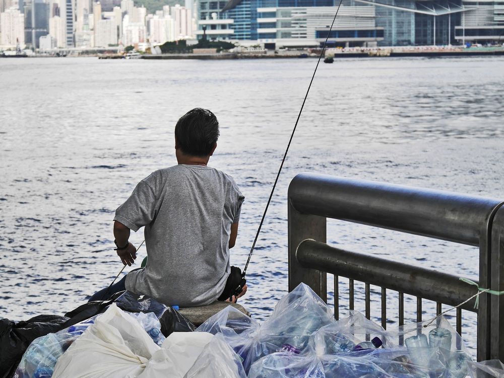 This image captures the common issues facing big cities, especially such a developed city as Hongkong. We have the man who tries to find normalcy by fishing in the harbor - probably out of nostalgia of times when the seas in this area were still rich with natural resources and marine life. The trash in the foreground shows the pressure consumption puts in waste management. As the population increases in Hong Kong because of the economic opportunities, there is also a growing need to manage plastic trash properly. In the distance, the famous undulating canopy of HK Convention & Exhibition Center paints a modern and forward-thinking version of the country.