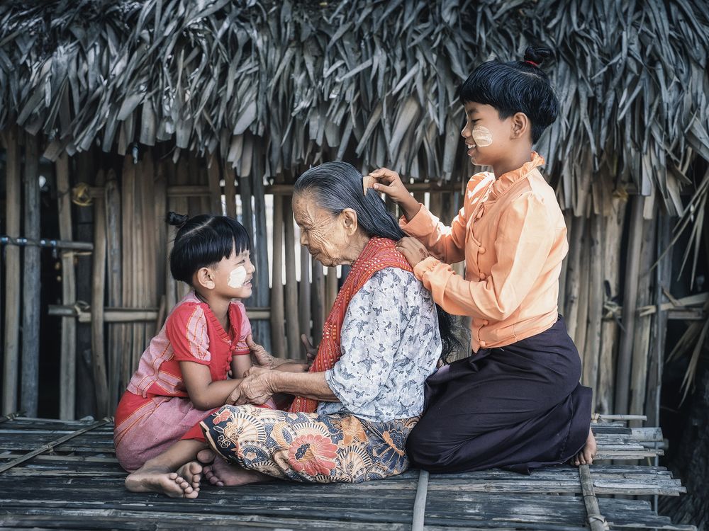 An elderly woman sits calmly on a bamboo platform while two children tend to her, with one gently combing her hair. This tender portrait captures a beautiful and heartwarming moment of intergenerational care and love.