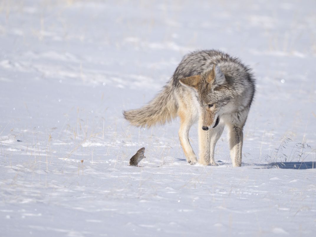 The coyote pulled the vole from under the snow, the tiny animal twisting and fighting back. Instead of killing it immediately, the coyote tossed and chased it briefly across the frozen ground before finally eating it—an unexpected mix of play and instinct.