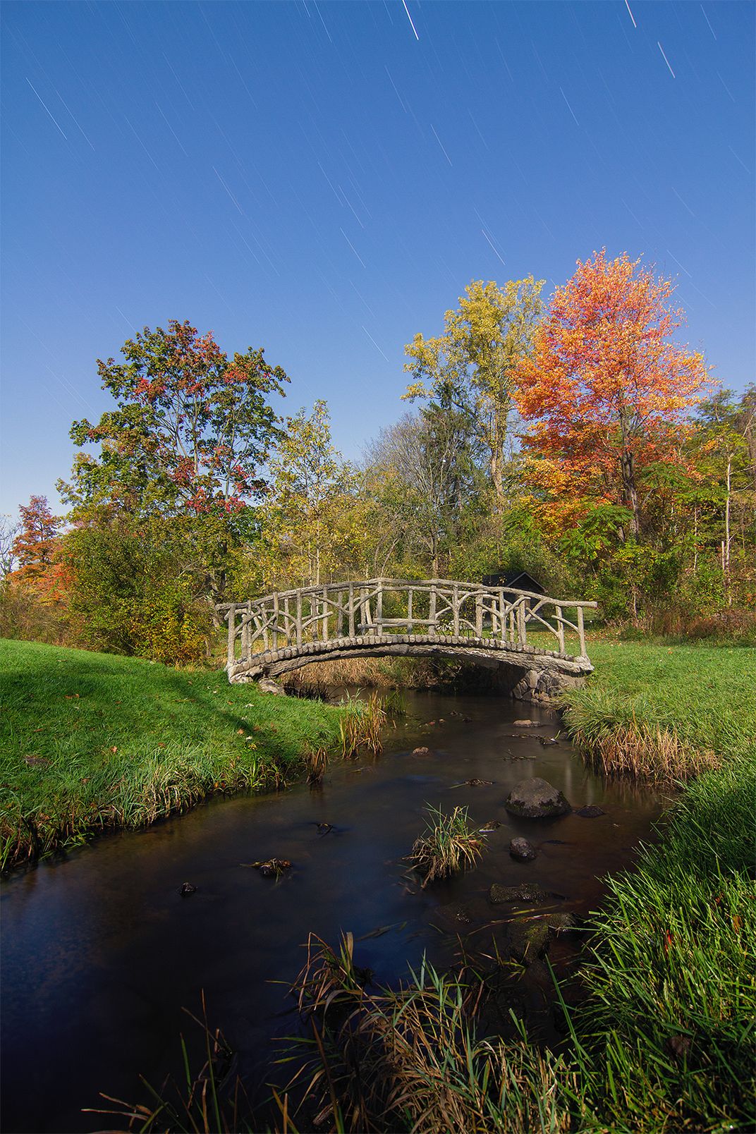 A moonlit long exposure of a historic McCourtie bridge in Somerset, MI