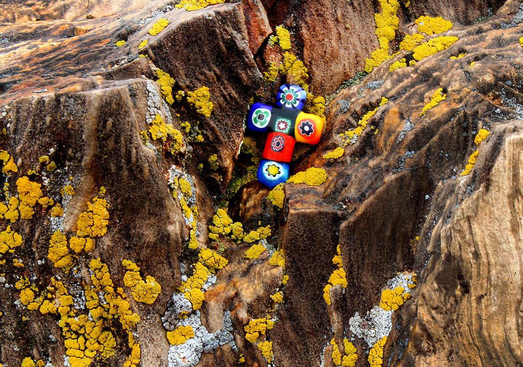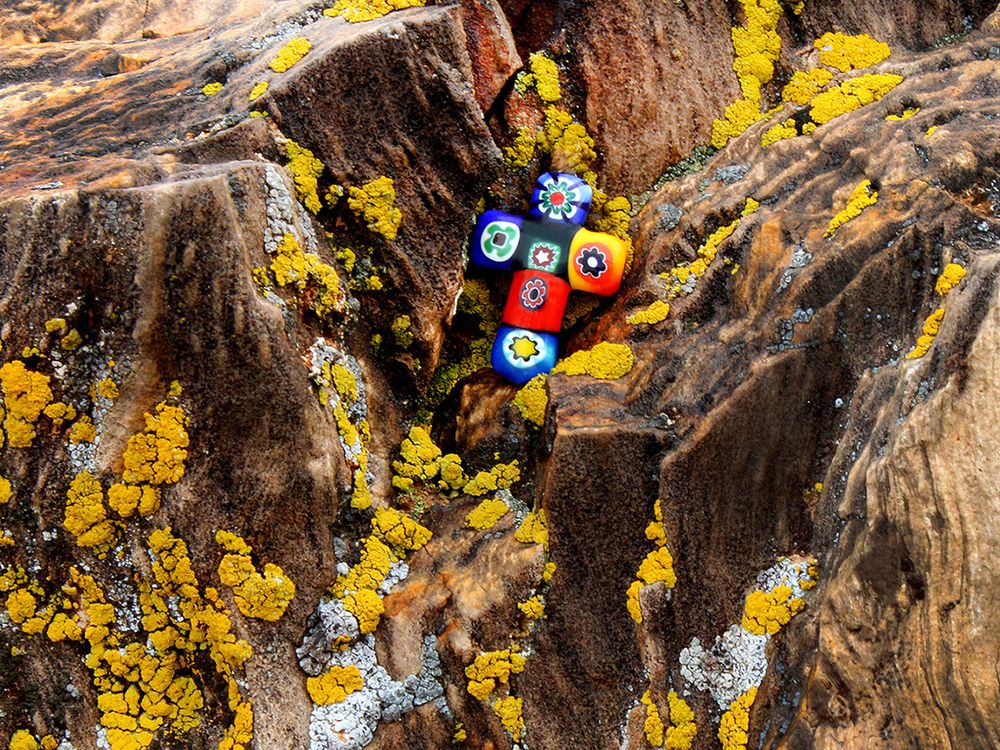 A murano glass cross sitting in petrified wood, surrounded by yellow and gray lichen.
