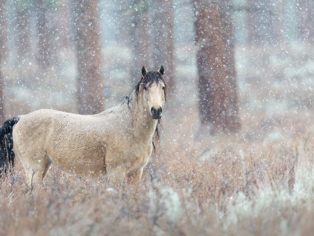 During a fresh Sierra Nevada snowfall near Mono Lake, this wild mustang stood in thin snow under the trees, so close I had to back away to frame him. I took the photo and he slipped quietly back into the forest.