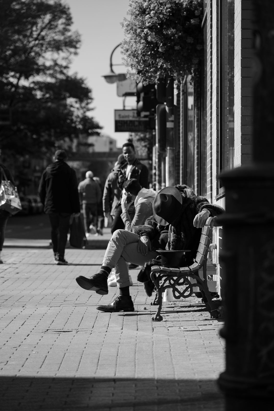 On a bright, warm morning in Old Quebec, the historic streets were humming with life. Yet amidst the motion, I was captivated by this island of stillness. There on a bench, a man sat in repose, his fedora pulled low to cast his face in anonymous shadow. Was he a weary traveler or a local character lost in thought? His story was a quiet mystery playing out in public. By capturing the moment in black and white, the scene is stripped down to its timeless essence: the stark contrast of light, shadow, and a silent, solitary human story.