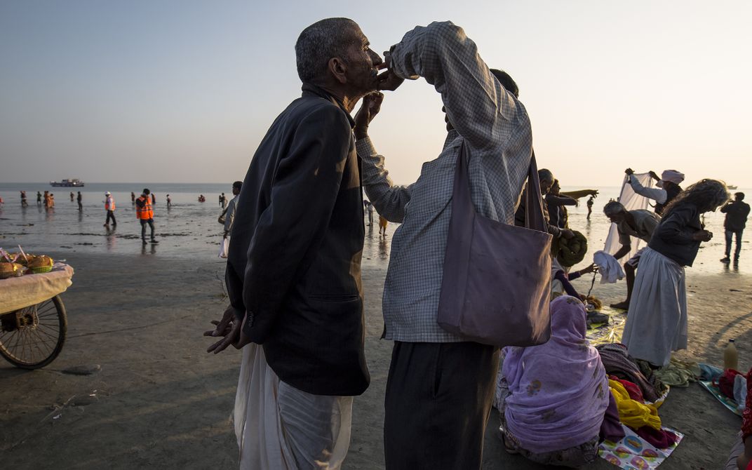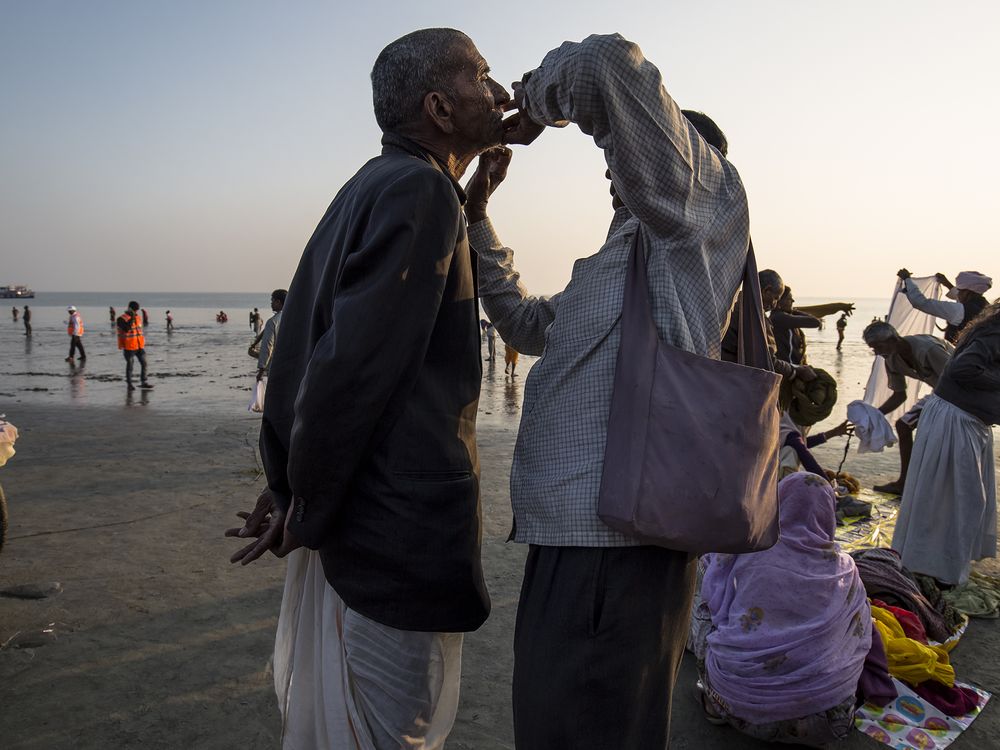 Popularly regarded as the second largest Pilgrimage gathering, Ganga Sagar Fair takes place on the day when millions of pilgrims from several states in India gather to take a sacred dip in the confluence of River Ganga and the Bay of Bengal on Makar Sankranti in the month of January. Lot of activities on the open beach side, even shaving their beard, changing clothes.