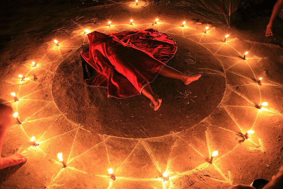 A night ritual begins at the pilgrimage of Maria Lionza in Quiballo, Venezuela. The red shroud represents the color of the spirit who will soon take form and possession of the pilgrim. The pilgrim will soon enter into a deep trance.