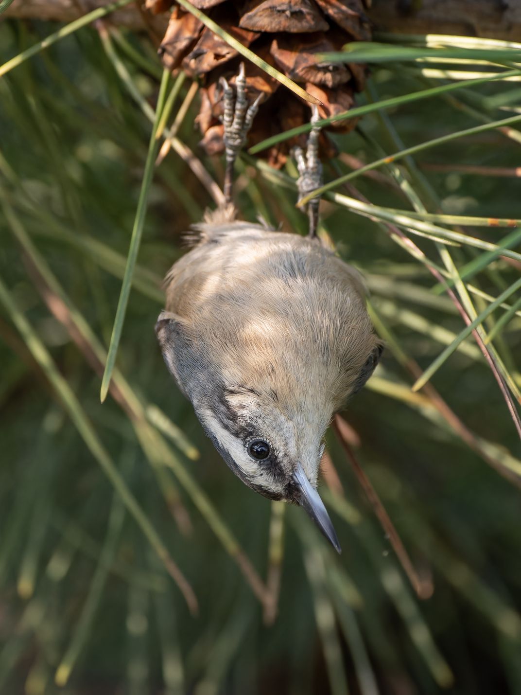 In its classic pine habitat, a nuthatch performs its specialty act: hanging upside-down. This rare talent sets it apart in the bird world.