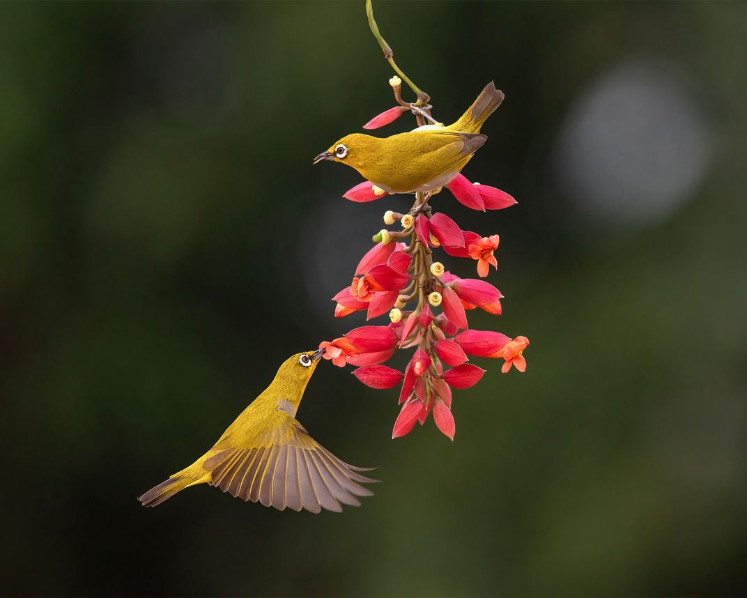 A pair of Indian white eye birds hovering around the flower petals to feed on nectar. It is a typical characteristic of the white eye, sunbirds and flower peckers to hover around the flowers before it lunges onto the petals for nectar. Hovering is the uninterrupted flapping of wings at high frequency.