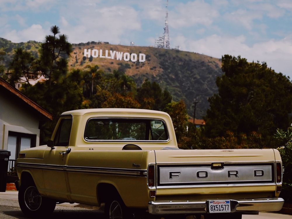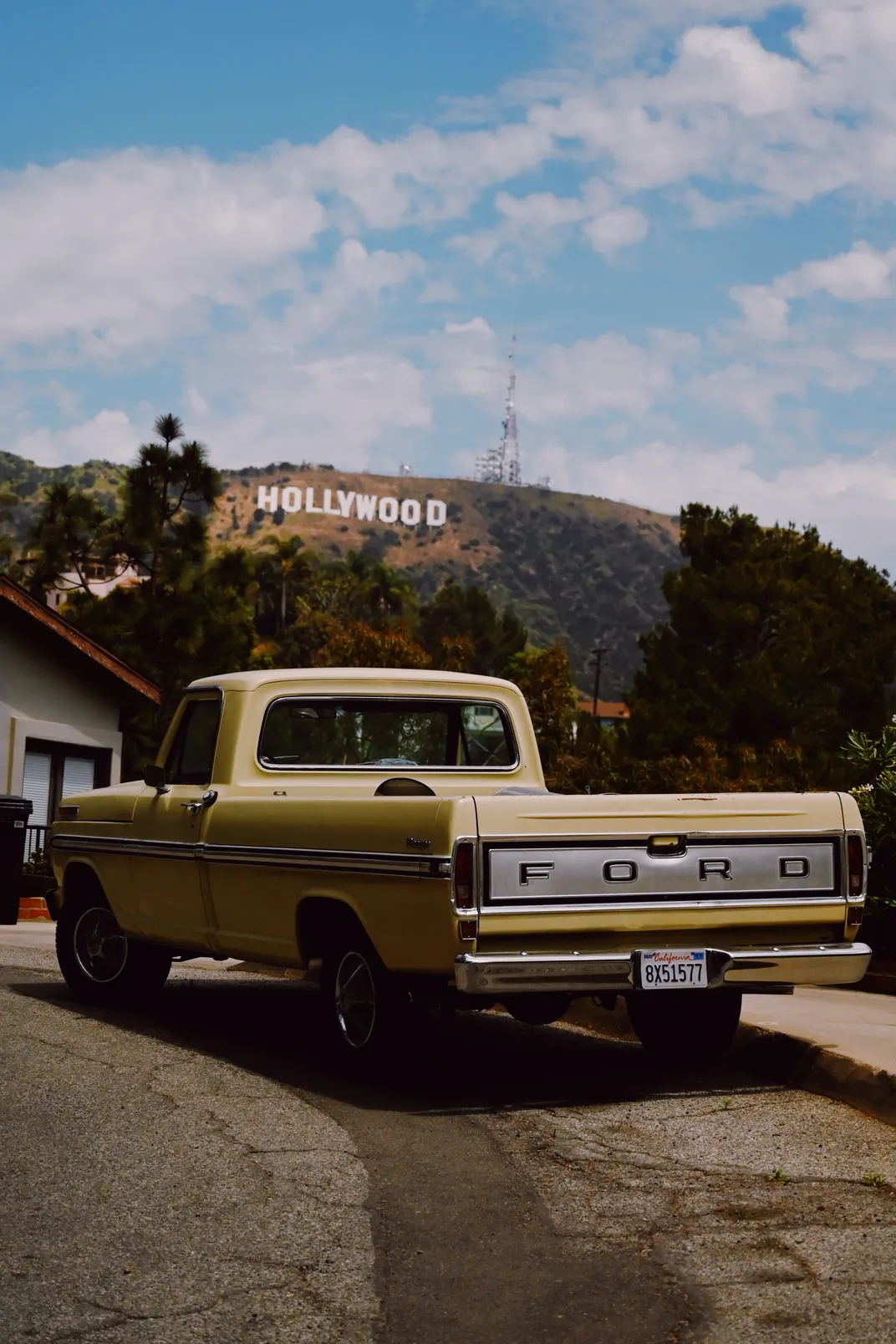 A pale yellow vintage Ford pickup truck under the Hollywood Sign