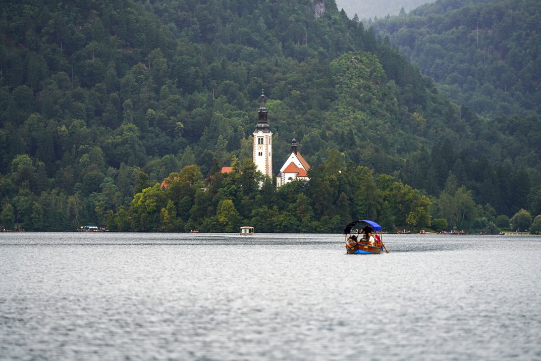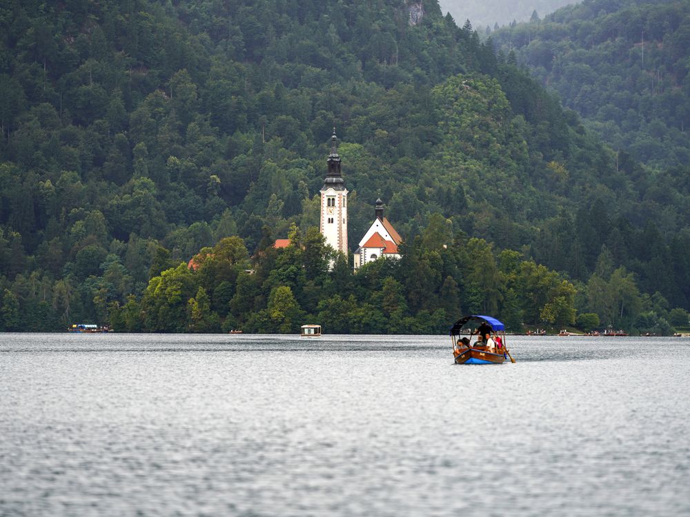 This evocative photograph captures the timeless beauty of Lake Bled in Slovenia. Nestled against a backdrop of dense, emerald-green forest, the iconic Pilgrimage Church of the Assumption of Maria stands sentinel on its tiny island, its white walls and bell tower creating a striking contrast with the surrounding nature. In the foreground, a traditional pletna boat, with its distinctive blue canopy, ferries passengers across the rippling surface of the lake. The slightly overcast day lends a soft, tranquil atmosphere to the scene, emphasizing the serene and almost mythical quality of this world-renowned destination. The image perfectly encapsulates the peaceful journey towards a fairy-tale landmark.