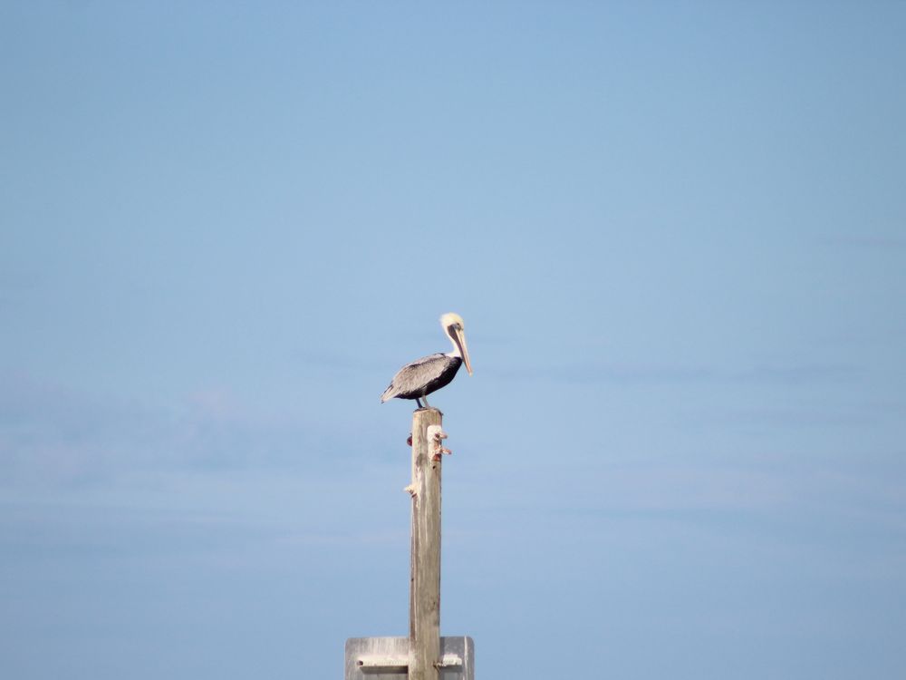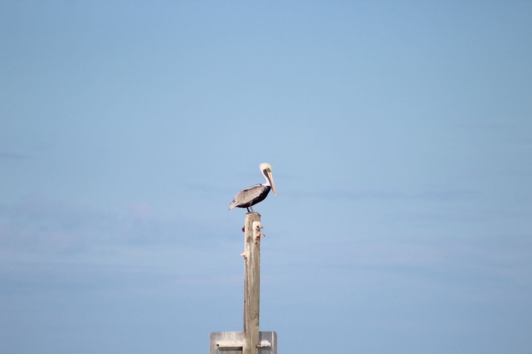 The pelican stands on a wooden pole surrounded by the Atlantic Ocean at Lighthouse Point Park.