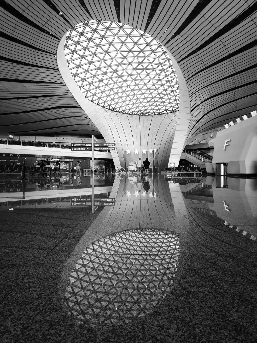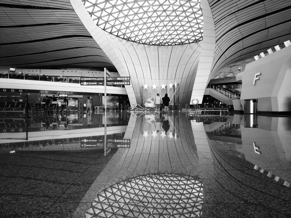 A patterned aperture breathes light into the terminal, its guiding lines designed to diffuse visibility. Below, the polished marble floor creates a perfect mirror, doubling the architectural form into an elegant illusion that expands the very perception of space and luminosity.