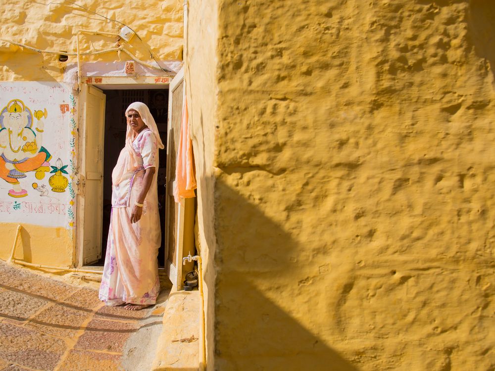 Portrait of an Indian woman stands in the doorway of a golden walls in Jaisalmer city. Jaisalmer is a city in the Thar Desert in the Indian state of Rajasthan, known as the "Golden City" for its golden-hued sandstone buildings. It is a historic city famous for its 12th-century fort, ornate havelis, palaces, temples, and surrounding sand dunes, offering a rich cultural experience and desert adventures.