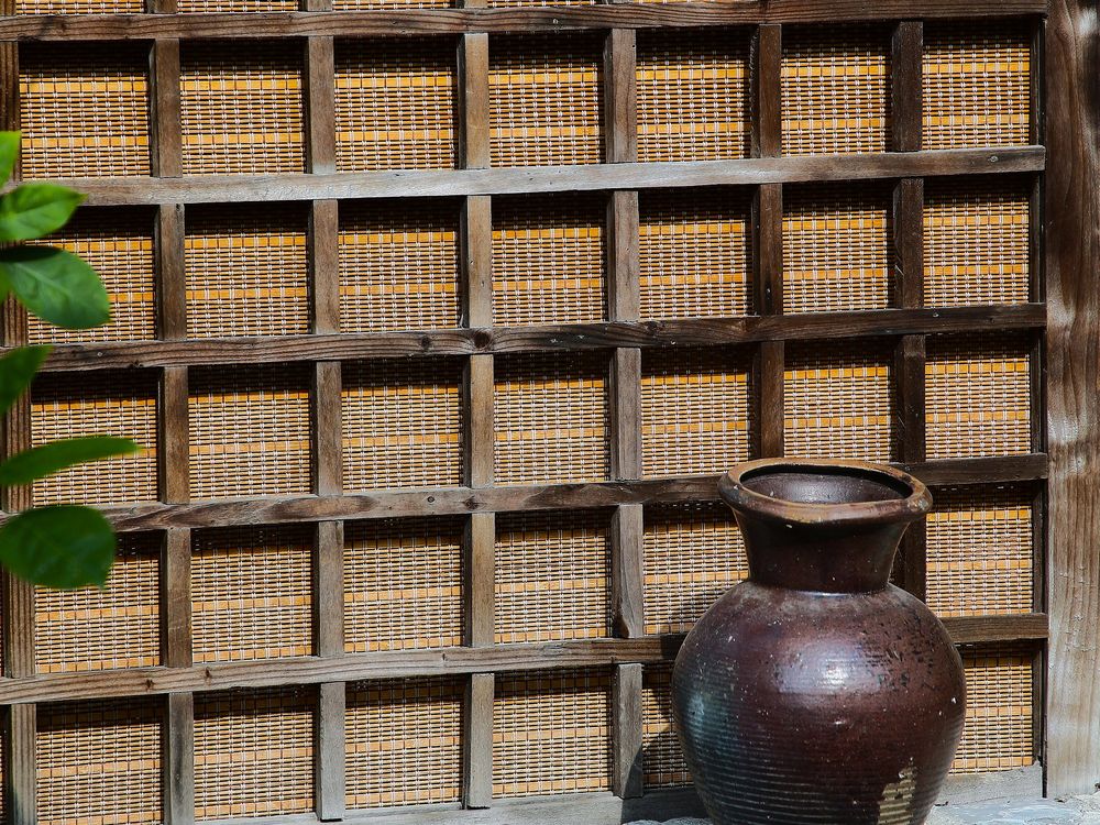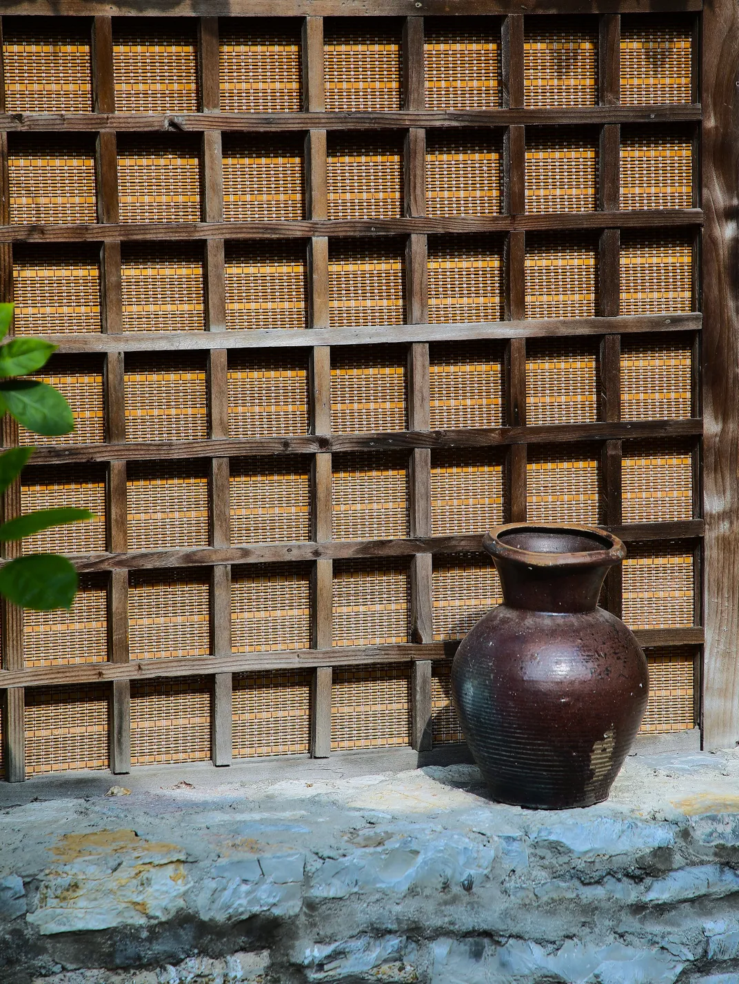 In Anshun,a small town in Guizhou Province in southwest China, there are some abandoned houses. This pottery jar sits quietly on the windowsill of one of these houses. The wooden lattice window behind it is covered by bamboo curtains from inside. To the left of the windowsill is a potted plant. The colors, shapes, and other elements of the pottery jar and its surrounding background create an artistic composition.