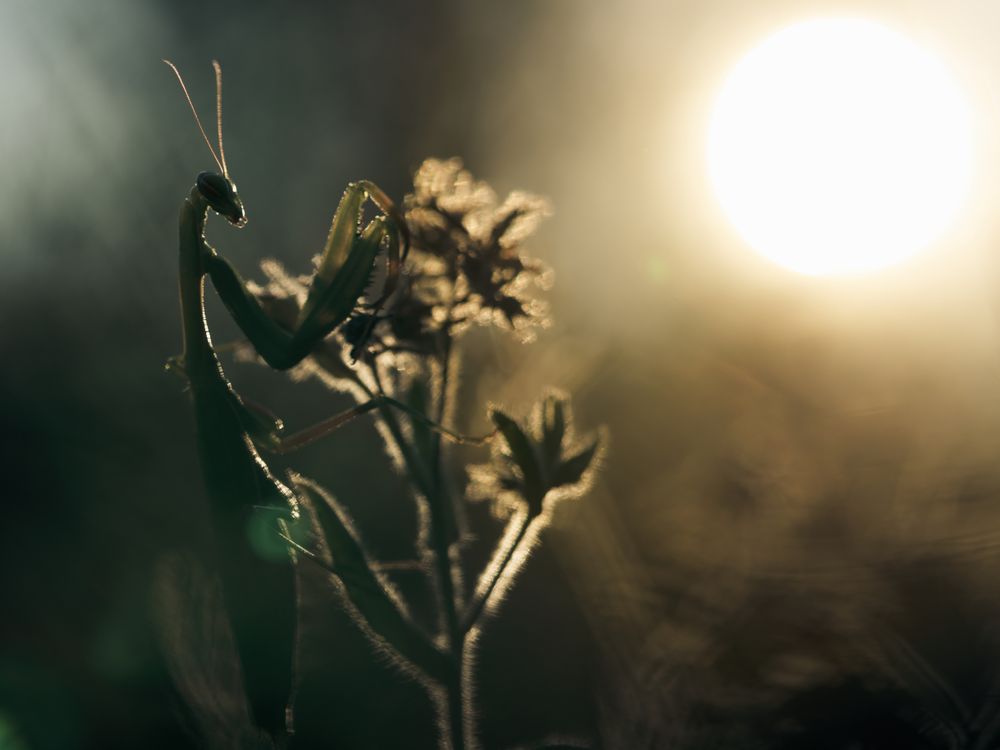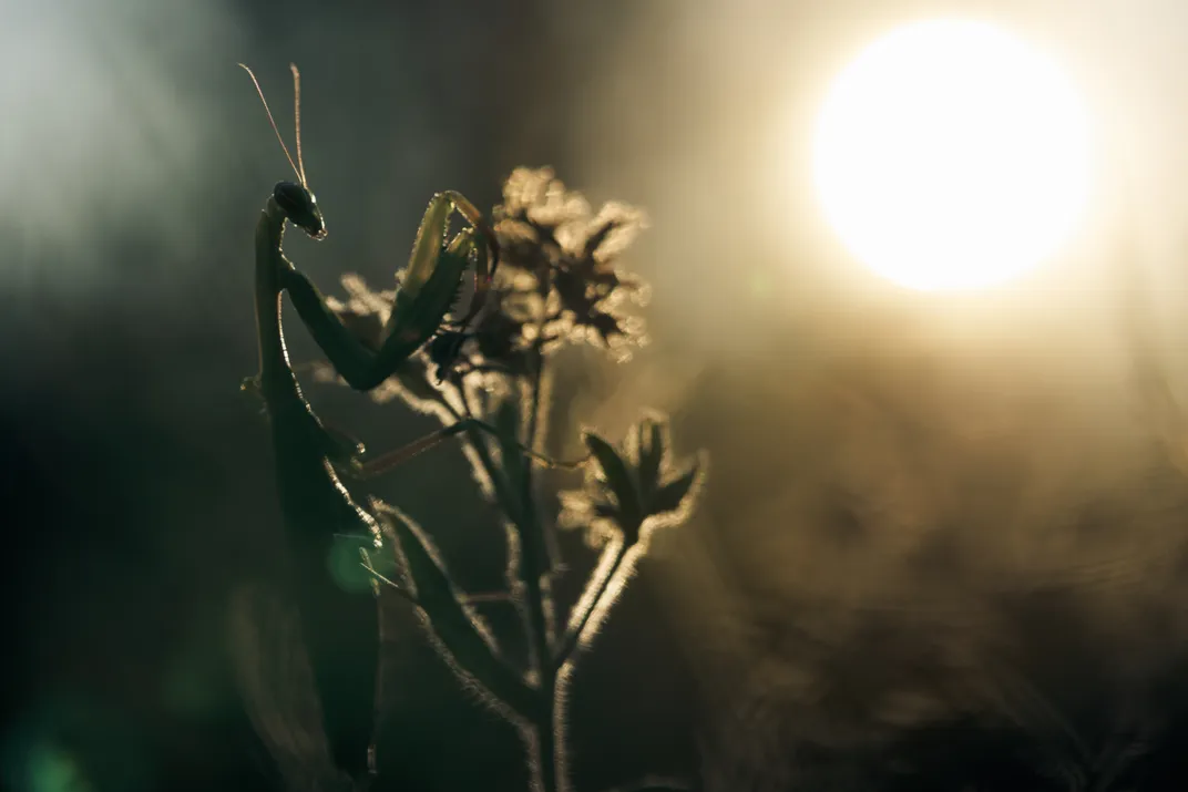 A backlit shot of a Mantis religiosa during golden hour. The frame negotiates the relationship between light and darkness, warm and cold colours, contrast and harmony.
