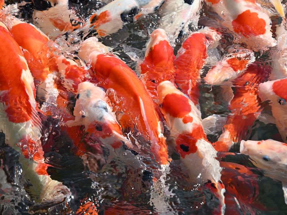 A school of vibrant koi fish swims in unison, forming a graceful procession in the tranquil reflecting pool of the Suzhou Museum. Their brilliant red and orange scales create a striking visual contrast against the clean, modern architecture and the calm water.