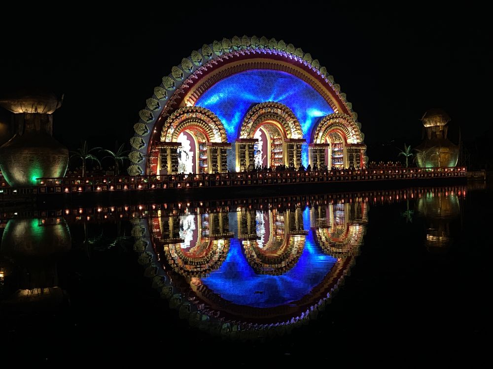 Amazing work of the people of West Bengal. This pandal shows the creativity of the people building it beside a lake including the lightings. The puja highlights the enthusiasm of the people of Kolkata by building pandals, crowding of people, lightings, shopping and etc.