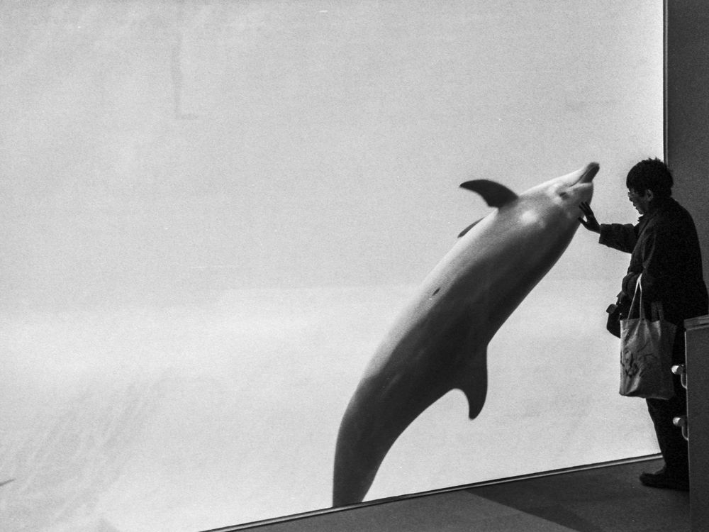 Captured on 35mm film, this monochrome image reflects a brief moment of human connection: a woman reaching toward a dolphin through glass, as two worlds meet in silence.