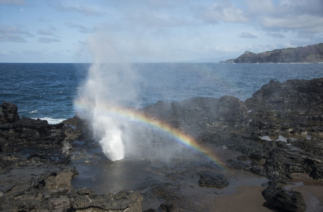A rainbow appears each time ocean water erupts through Mauiʻs Nakalele Blowhole