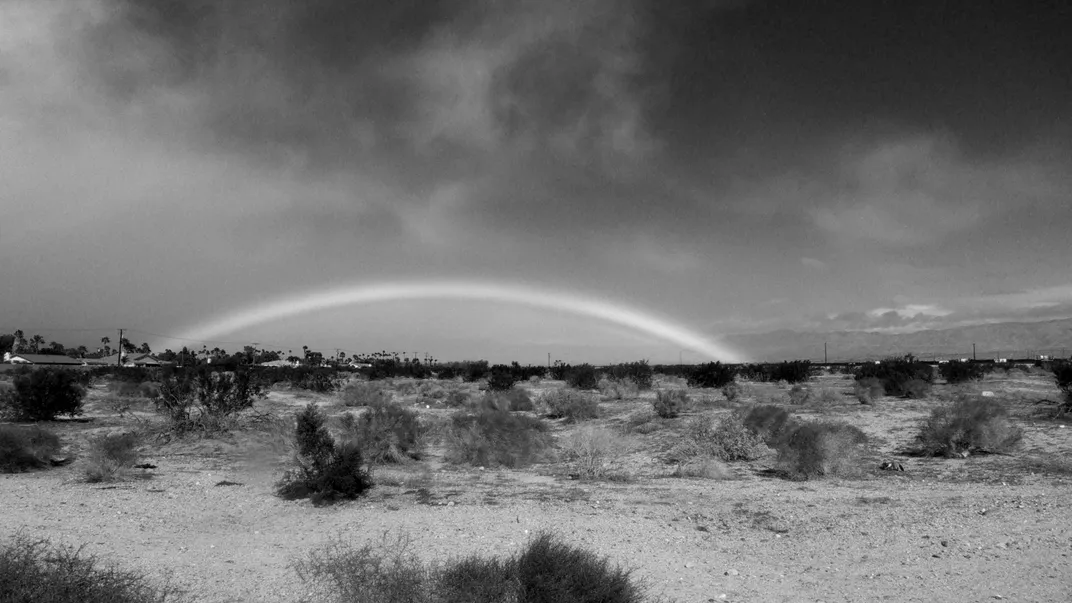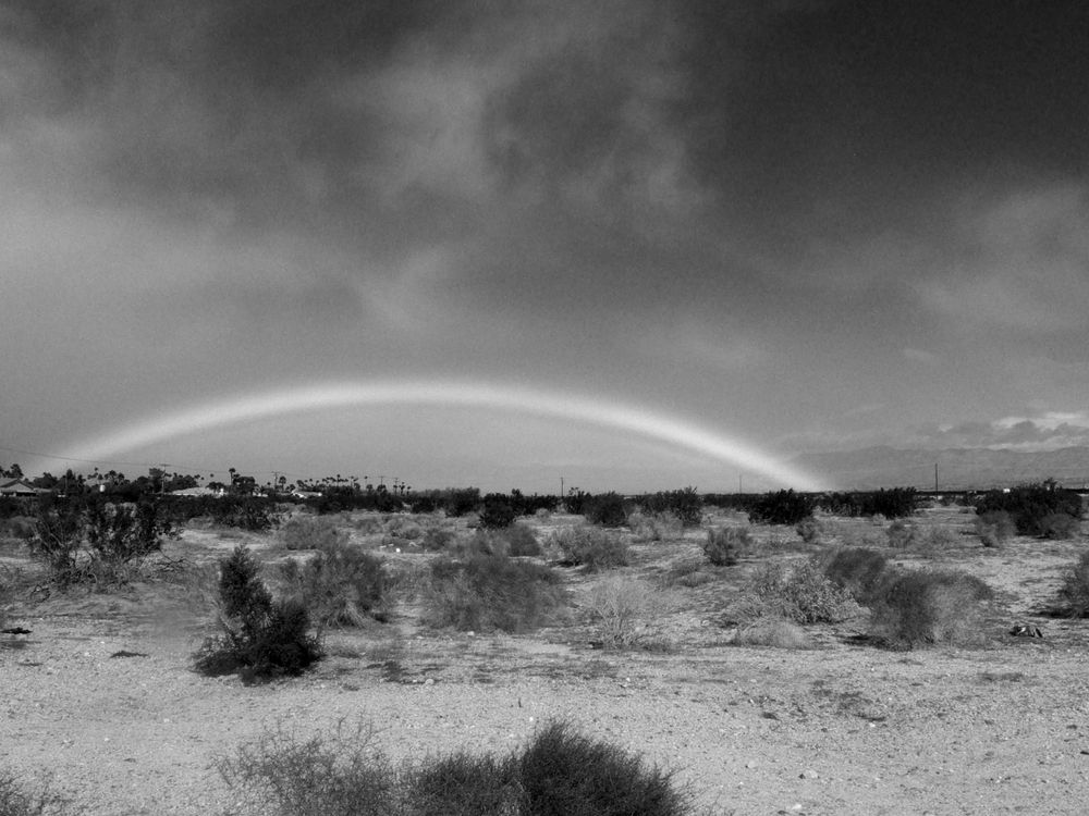 A rainbow in the desert in Palm Springs, California appears as an ivory arc of light when taken in black and white.