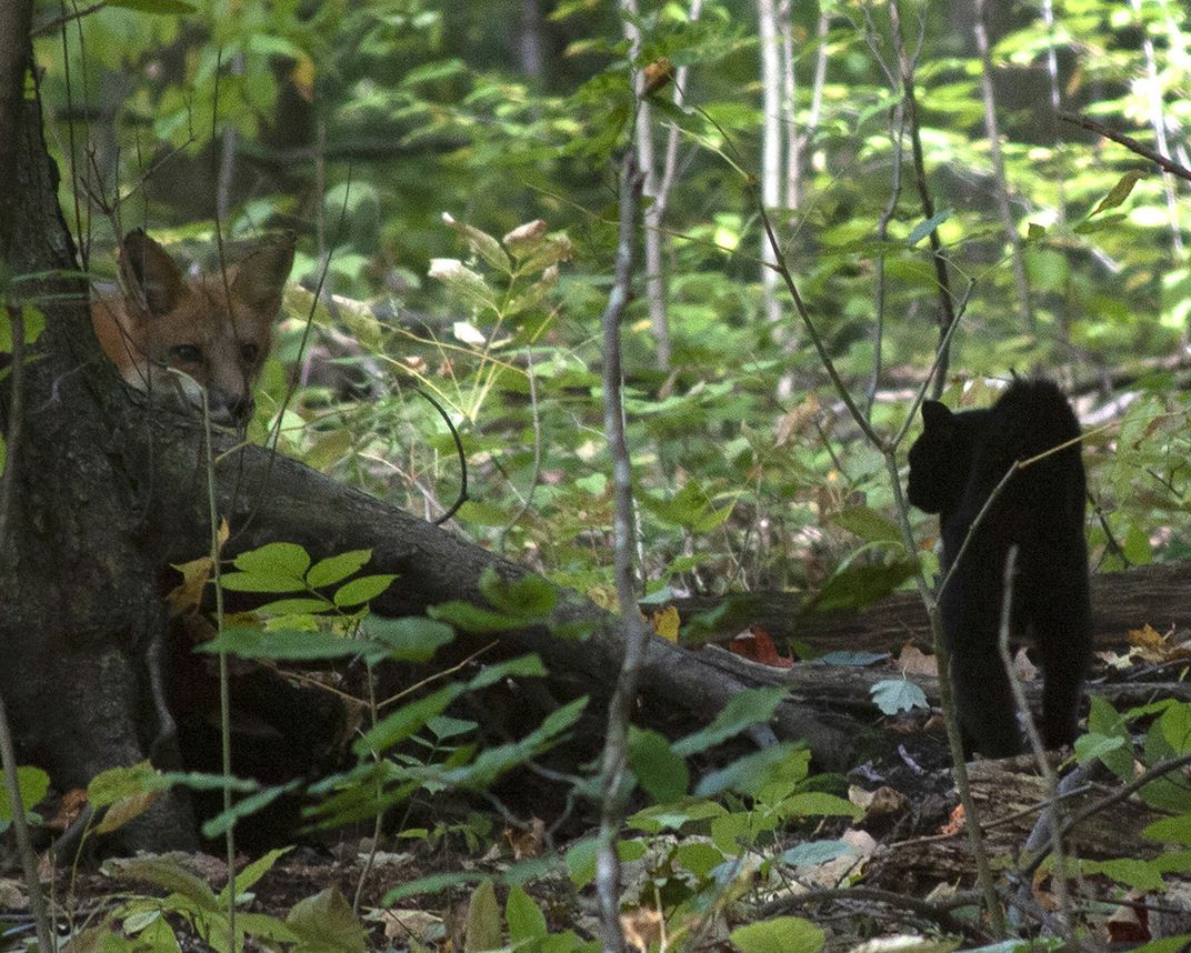 A red fox comes across a feral cat in North Chagrin Reservation, Ohio
