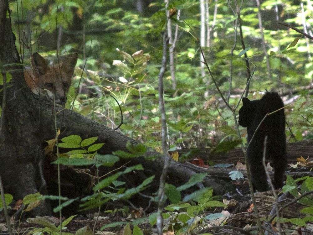 The red fox was sighted in the North Chagrin Reservation, a metro park near Cleveland Ohio. The fox encountered the feral cat not far from a hiking trail and kept circling it trying to gain an advantage, but the cat was not backing down. It was a standoff for over five minutes until my companion stepped on a twig that snapped with a loud crack, and the fox looked away and the cat vanished in the underbrush.