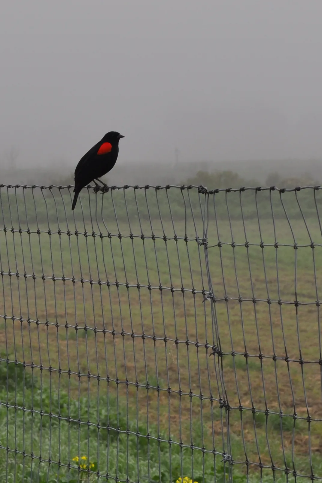 A red-winged blackbird sitting on a fence on a foggy day in Pleasanton, California.