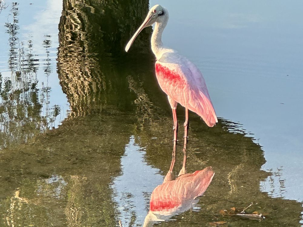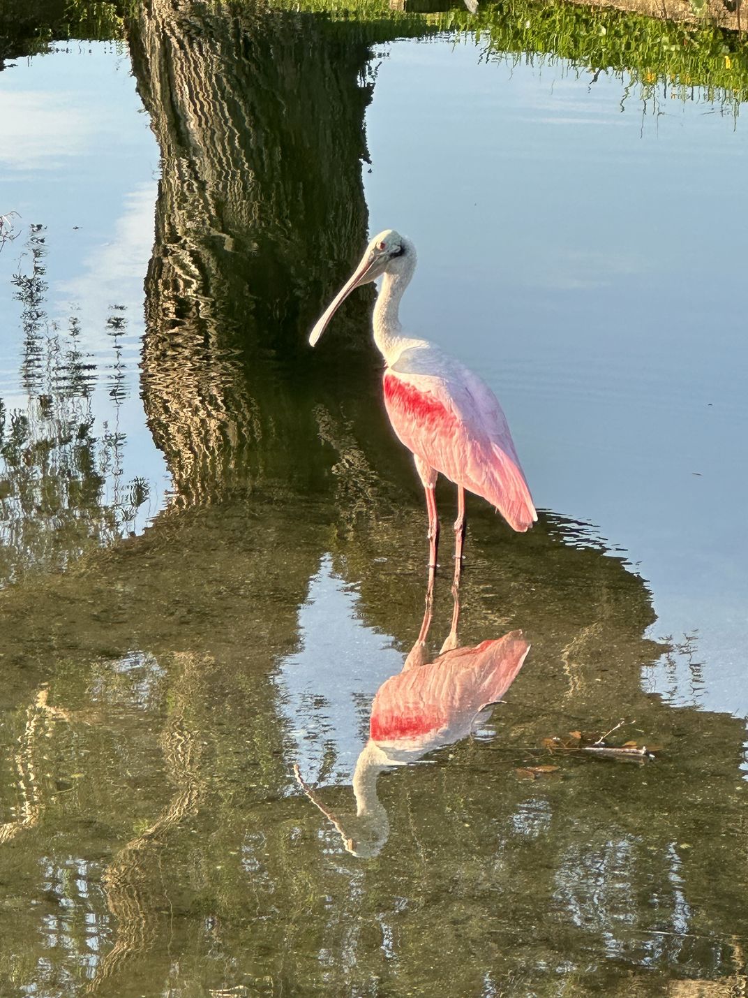 Roseate spoonbill standing in shallow water looking for breakfast. Have lived in my neighbor hood 31 years and this was the first spoonbill I'd ever seen hanging out in our lakes.