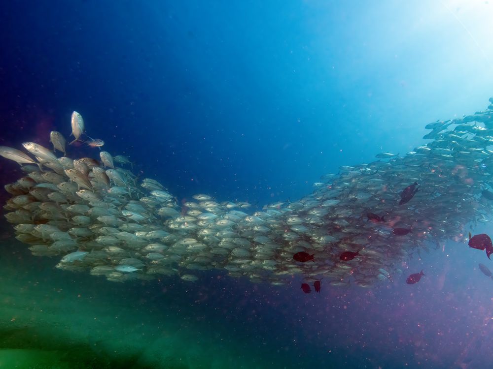 In this image I was able to capture the large school of Big-eye Jacks (Caranx sexfasciatus) in Cabo Pulmo streaming across the ocean bottom, resembling a river.