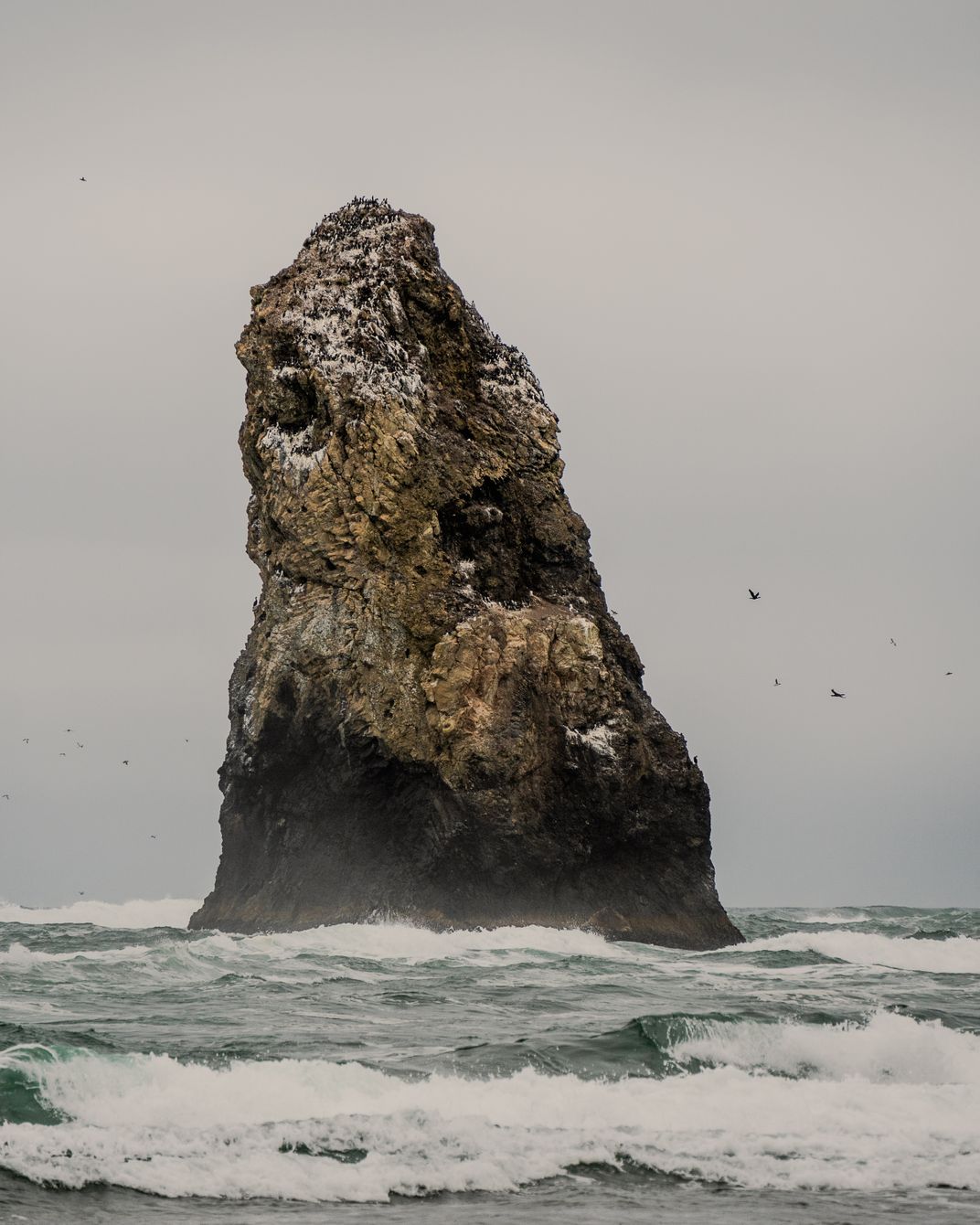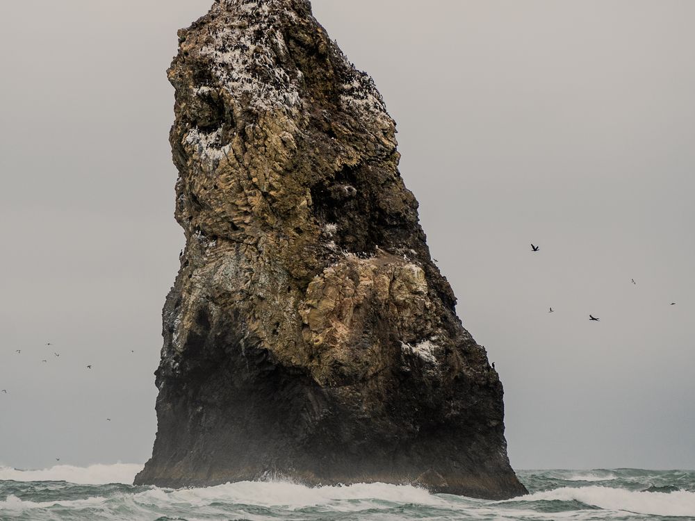 This photo showcases one of the giant ocean rocks at Cannon Beach, surrounded by crashing waves and circling birds.