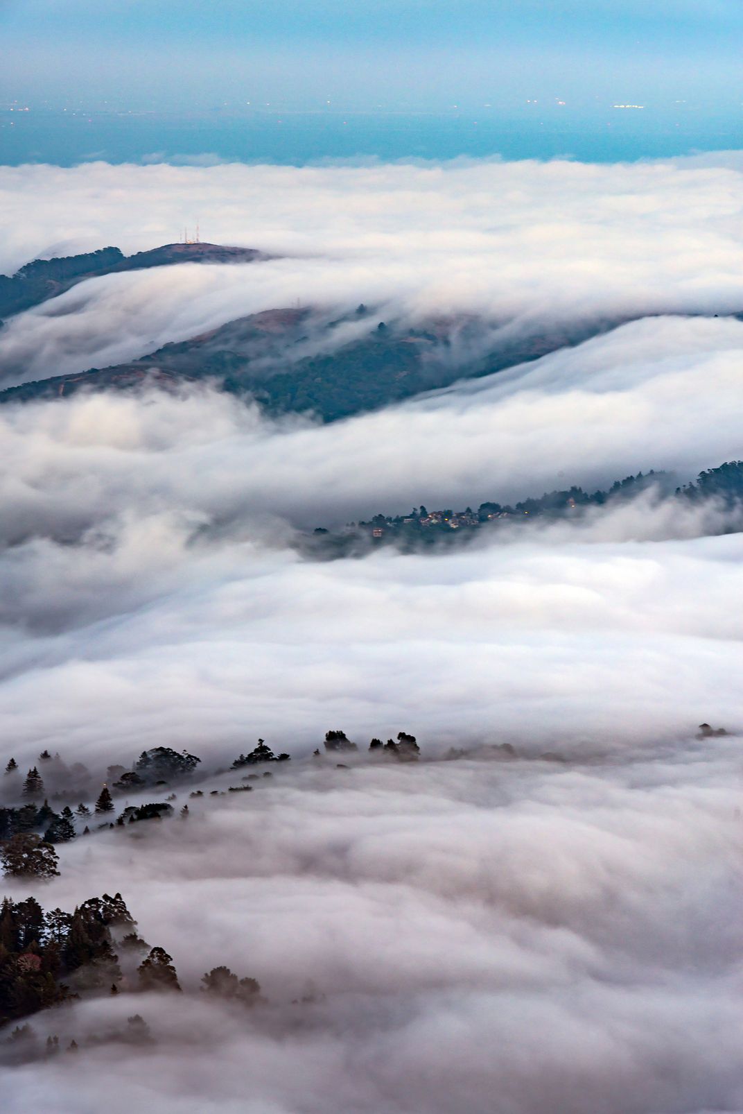A rolling fog at Mt. Tamalpais State Park right after sunset, Marin County north of Golden Gate bridge in San Francisco.