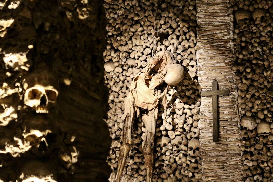 The Capela dos Ossos (English: Chapel of Bones) in Evora, Portugal, gets its name because the interior walls were covered and decorated with human remains in the 16th century. The number of dug-up skeletons used from the surrounding Medieval cemeteries is estimated at about 5000.
