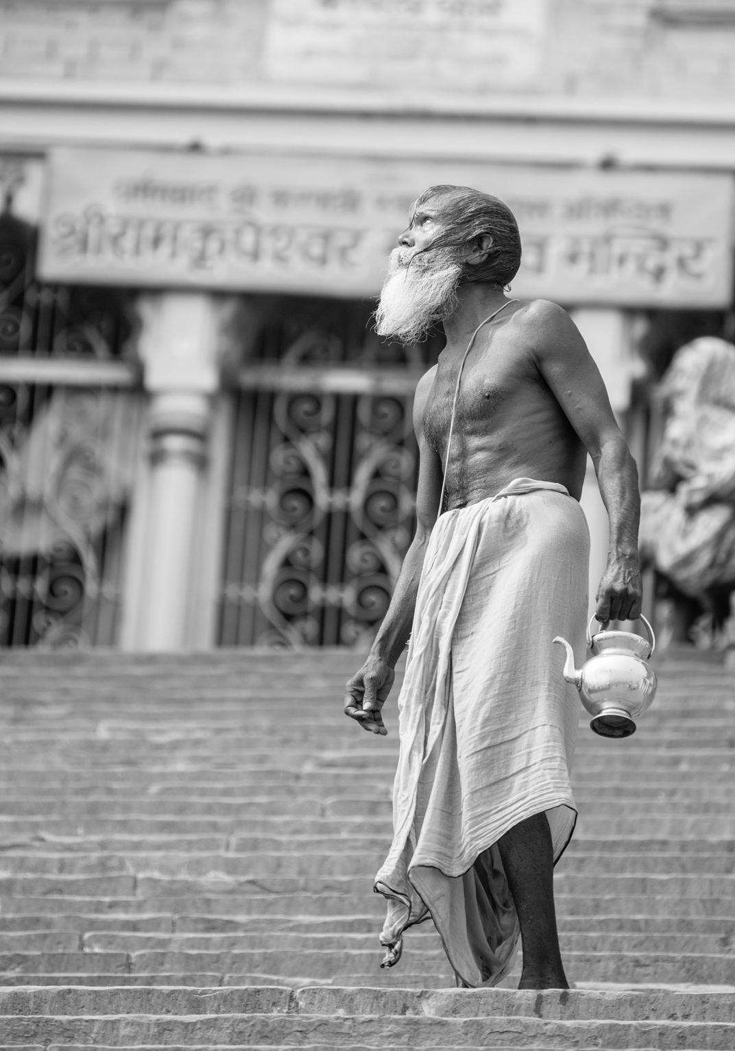 A sadhu looks up to the Gods, on his way to take puja and bath in the holy waters of the River Ganges