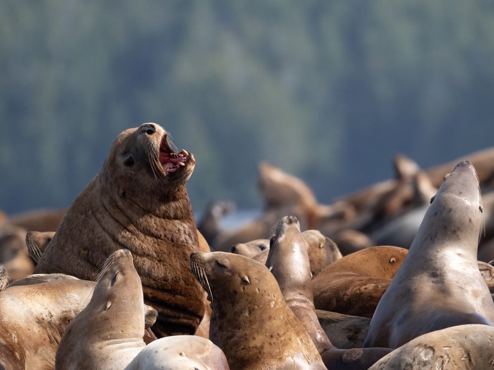 Steller sea lions crowd a rocky outcrop in the Great Bear Rainforest, their calls rising over the swell. One larger sea lion lifts its head above the group, briefly standing out amid the noisy gathering.