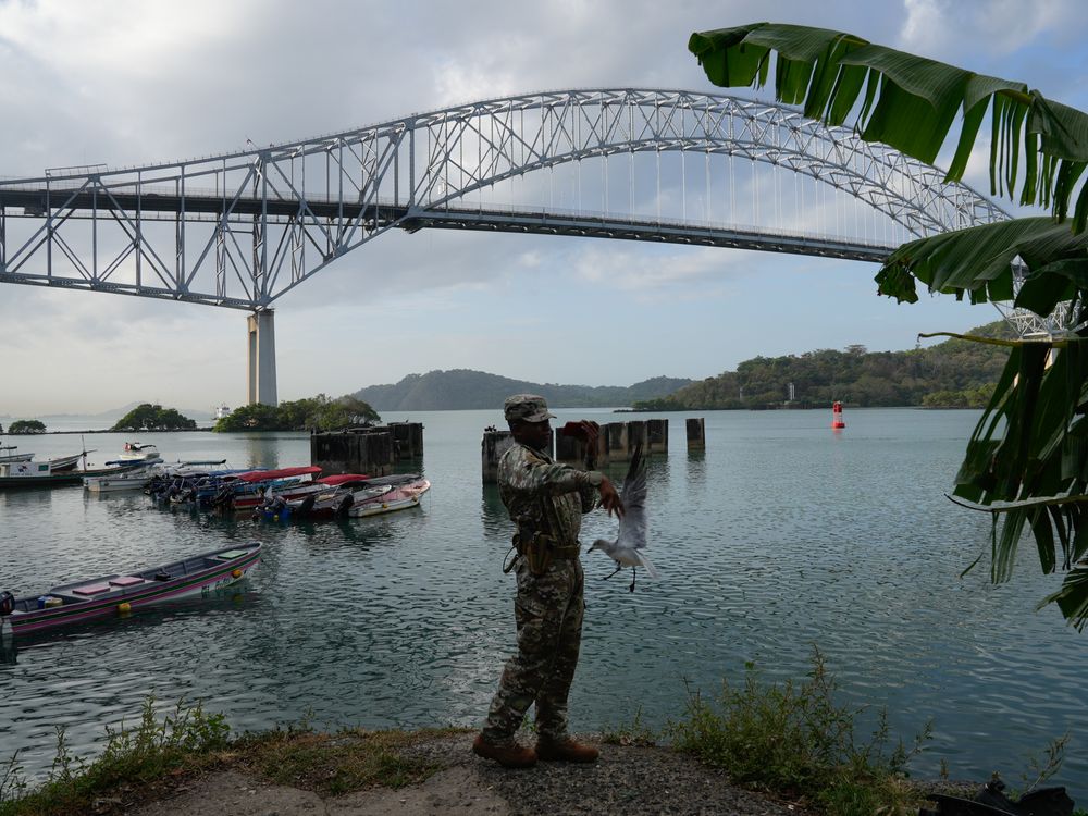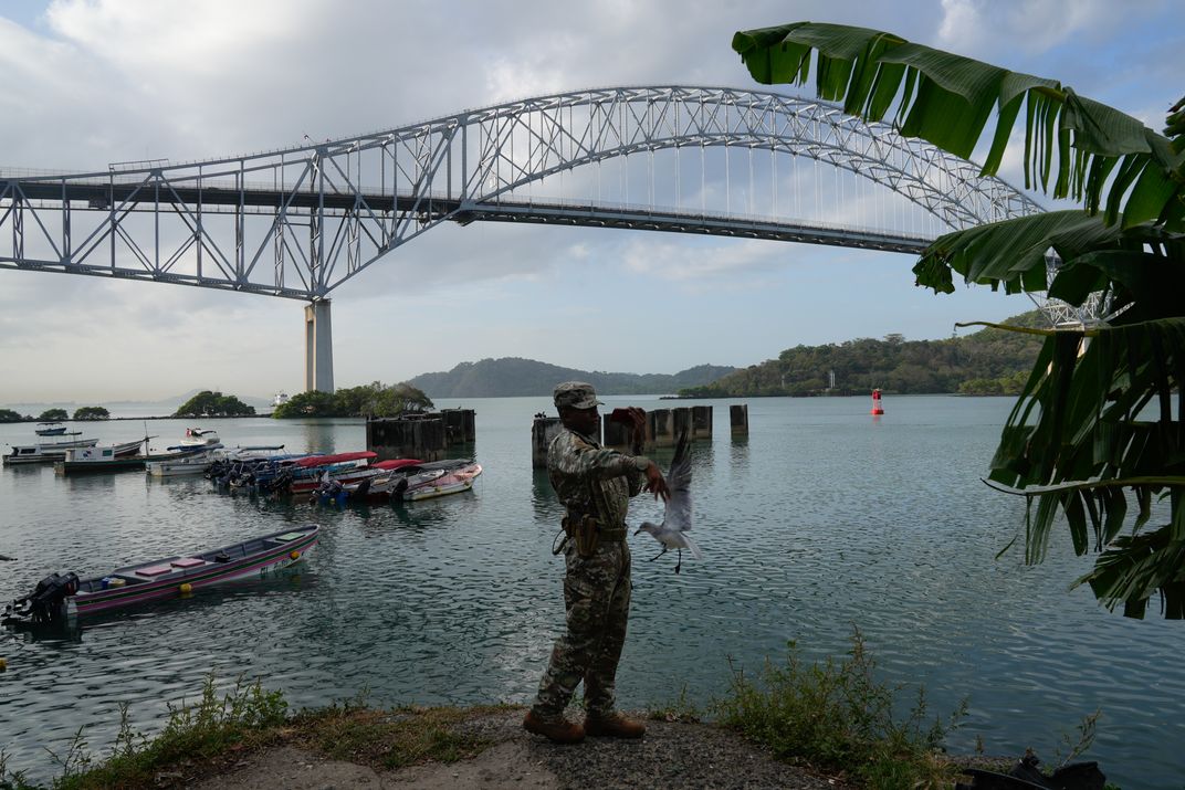 A police officer reacts as a seagull unexpectedly collides with him at a small fishing port beneath the Bridge of the Americas, in Panama City, Panama.