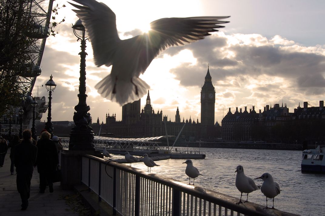 A seagull flying on a cold winter day in London