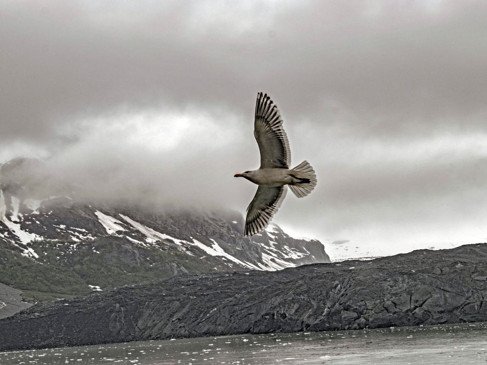 A seagull in flight over Glacier Bay in Alaska.