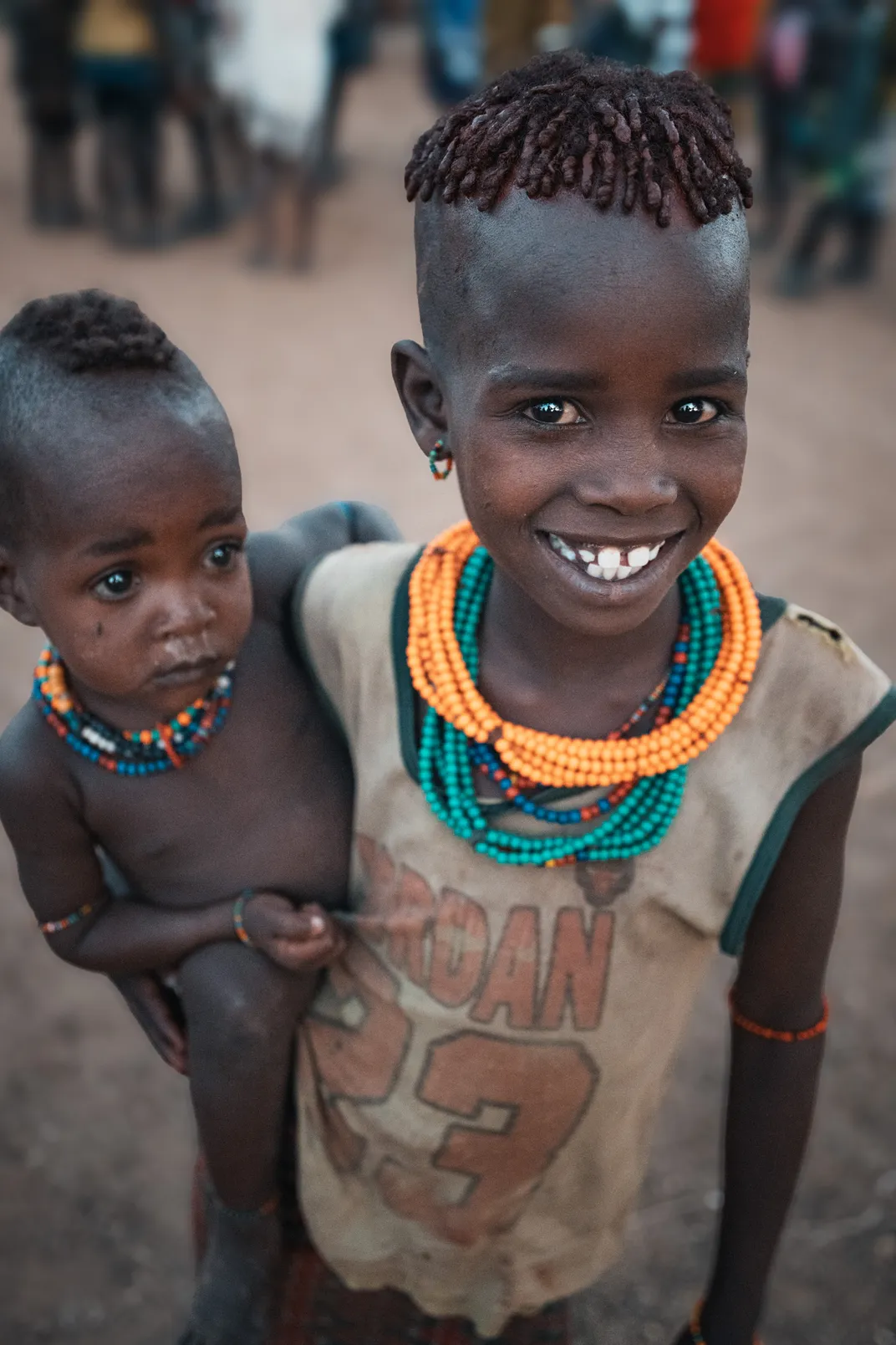 Two children from a community near Jinka share a fleeting moment of joy, adorned with vibrant beadwork. Their bright smiles and close bond reveal the warmth and resilience of childhood in this remote region.