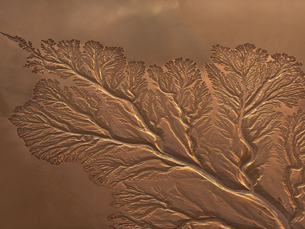 Sunrise illuminates the Colorado River Delta, revealing a stunning web of dry channels etched into the desert. Once a thriving waterway, the delta now showcases the intricate beauty left behind by the river’s fading flow.