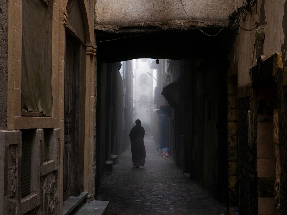A local Moroccan woman walks down a narrow alleyway. The worn stone walls rising close on either side show shadows as a hint of light and mist travel down the alley to highlight the moment.