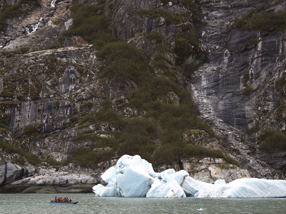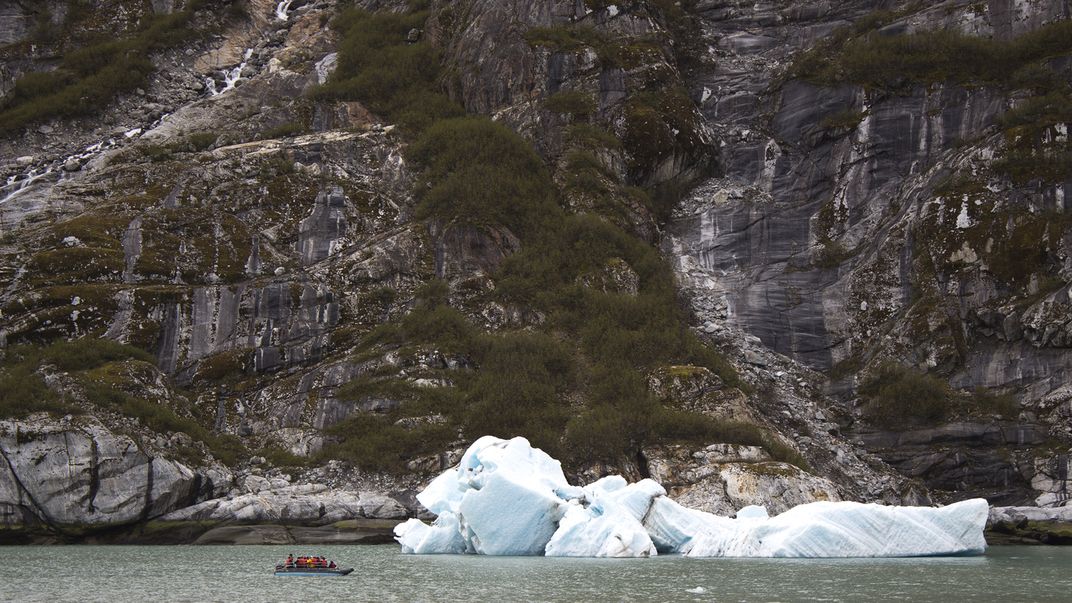 A skiff of tourists pass a large bergy bit in the Endicott Arm near Dawes Glacier in Alaska.