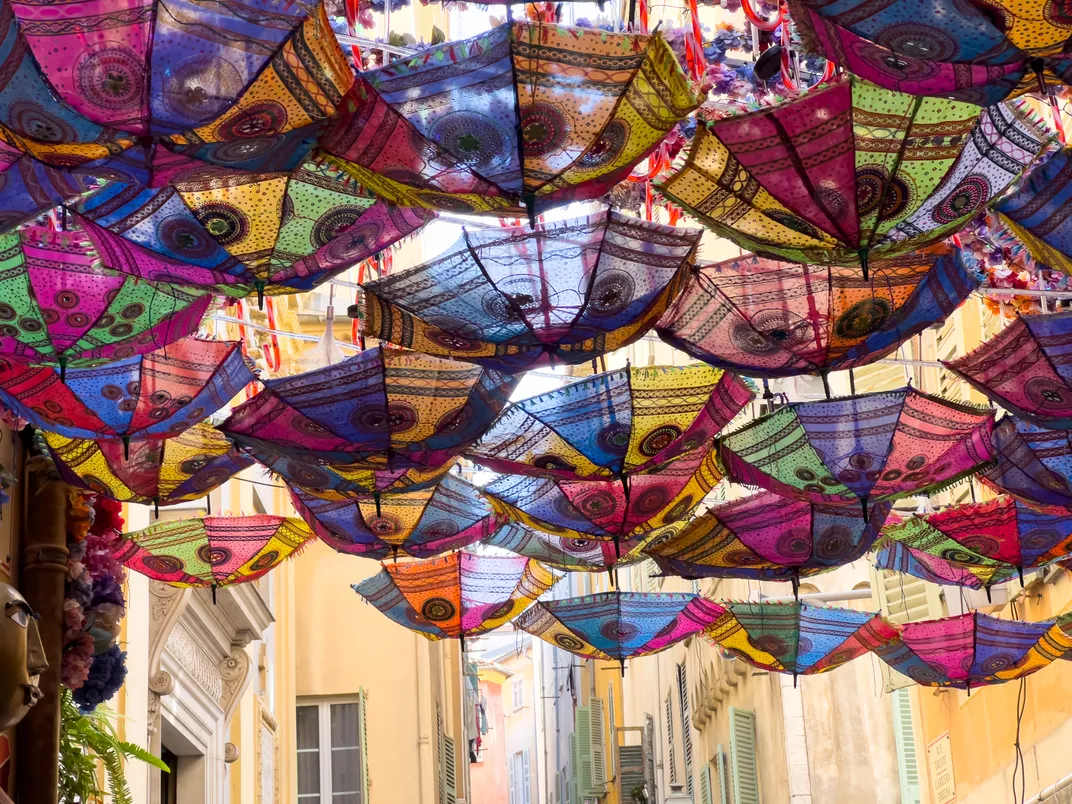 I came upon a rooftop of colorful umbrellas in Old Nice, France and liked the contrast with the pastels of the buildings.
