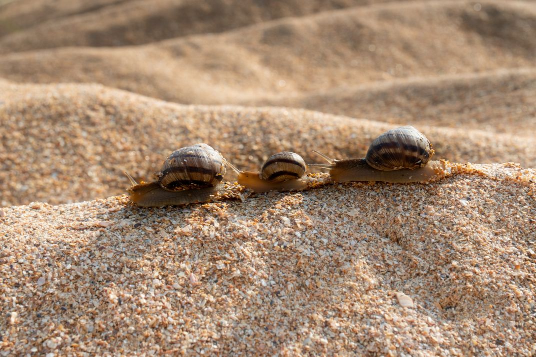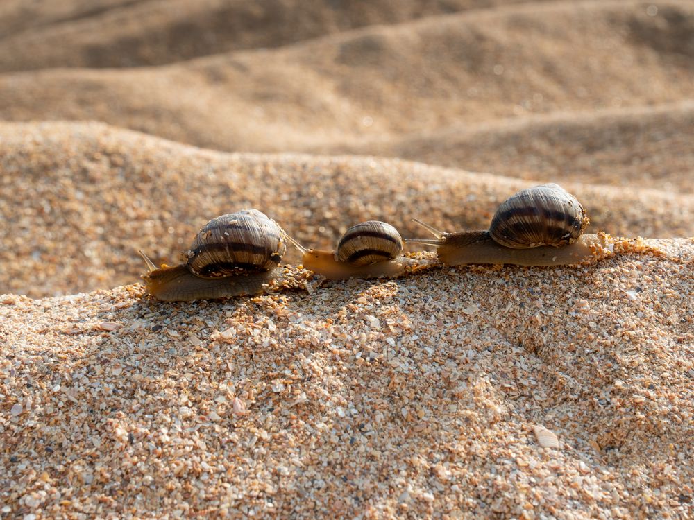 Early in the morning at the seashore, the snails gathered for a long journey.