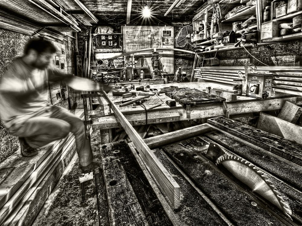 A small garage where wooden boat is being built