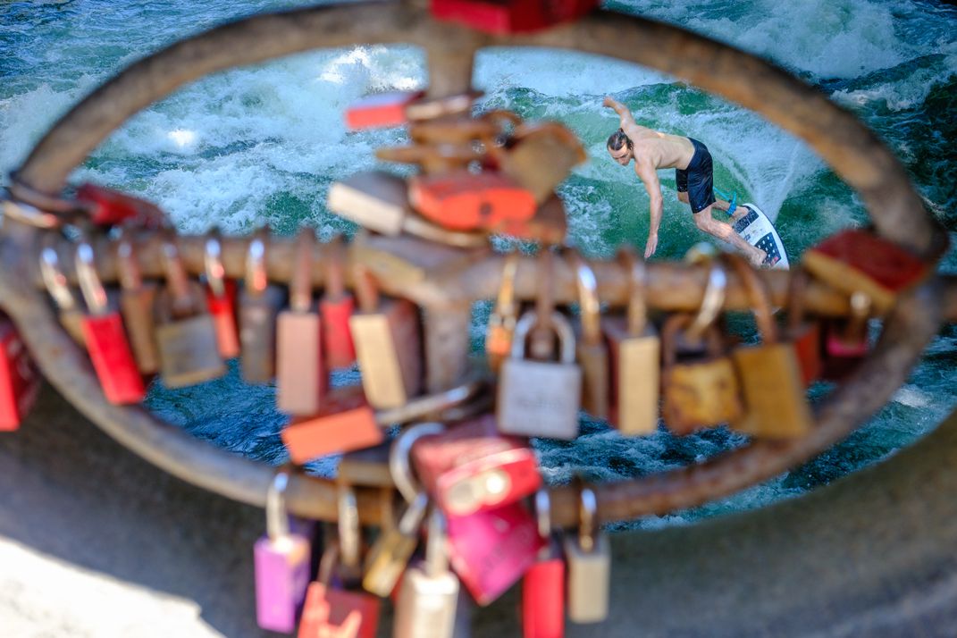 A surfer at the Eisbach Wave in the Englischer Garten, Munich August 2024. There is a very strong current, which attracts many surfers. One after the other tries to stay upright as long as possible.