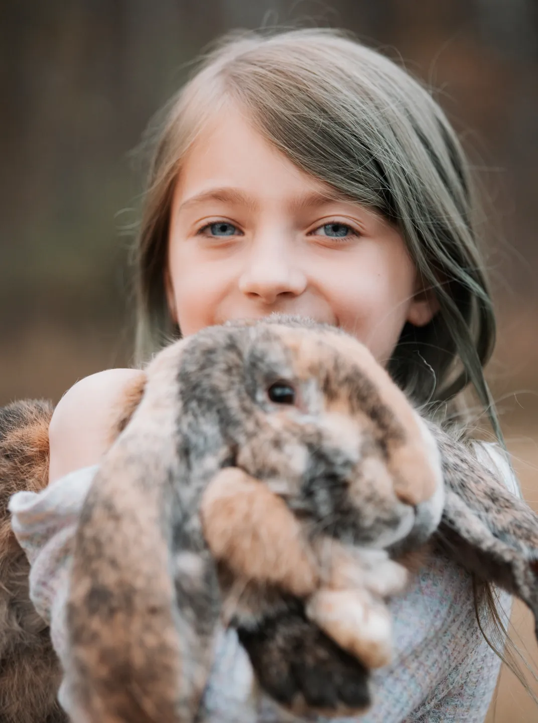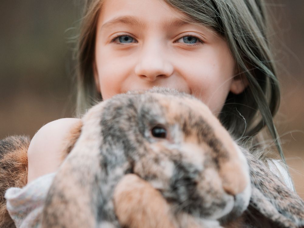 This is Bella. She's a very energetic and brilliant young lady who loves every animal on the planet, and yes, that includes this strange giant rabbit. What makes this photo award worthy is a big, genuine smile that hides behind her rabbit and those pretty blue eyes.