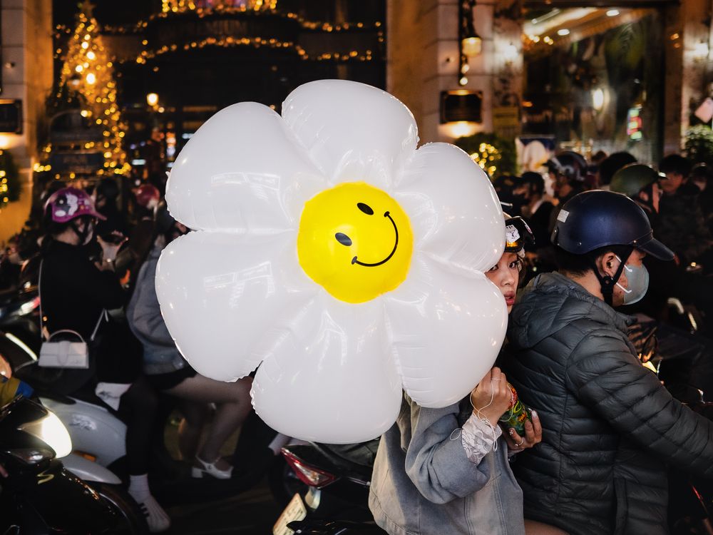 A woman rides through Hanoi’s busy night traffic holding a giant smiling flower balloon. The playful contrast between the cheerful balloon and the chaotic street captures the humor and energy of urban life in Vietnam.