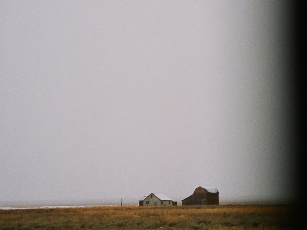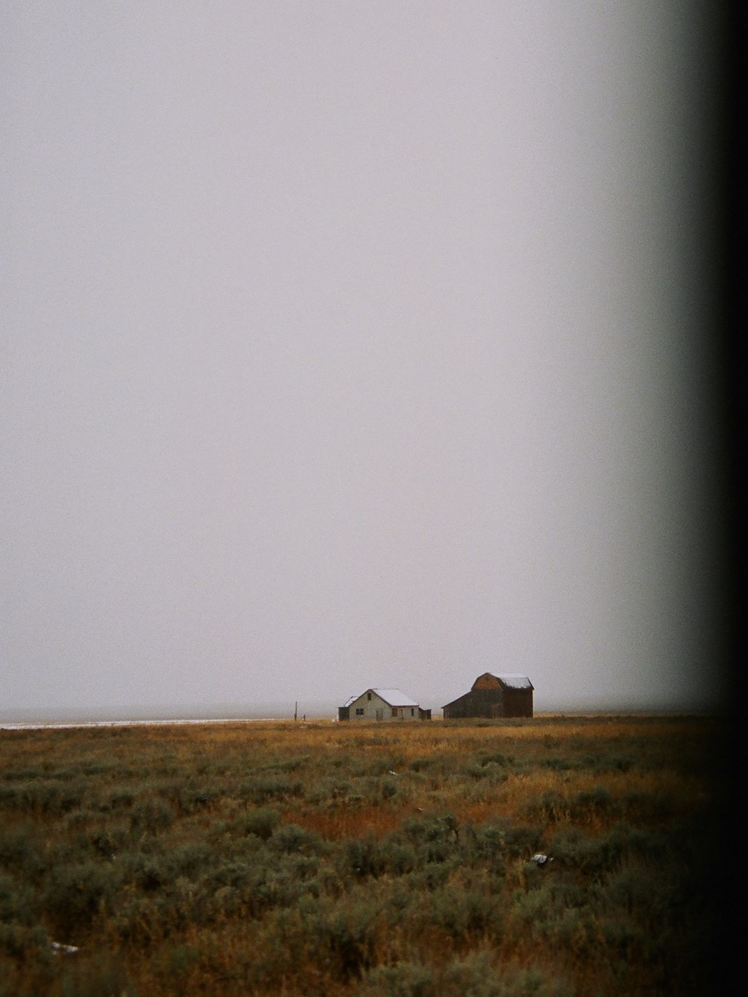 A snow-covered farmhouse and barn all on their own. The film didnt advance properly inside the camera leaving the black fade on the side of the shot. I feel as though the malfunction actually added a sense of isolation to the already desolate image.