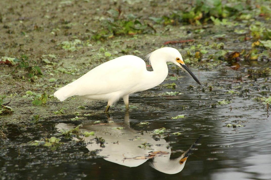 A Snowy Egret hunts in the shallow waters of the Goose Creek Reservoir in Hanahan, S.C.