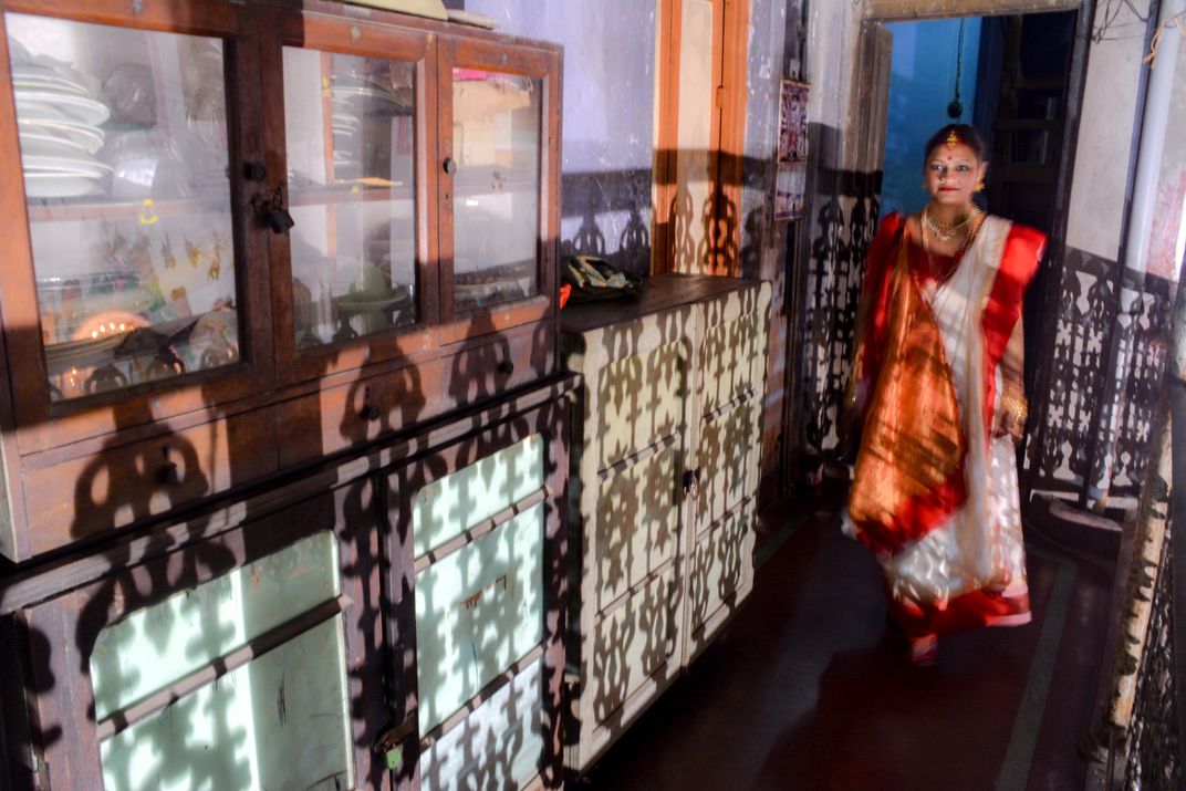 A special occasional day of Indian Hindus is Bijoya doshomi . The lady is coming out with the traditional dress .