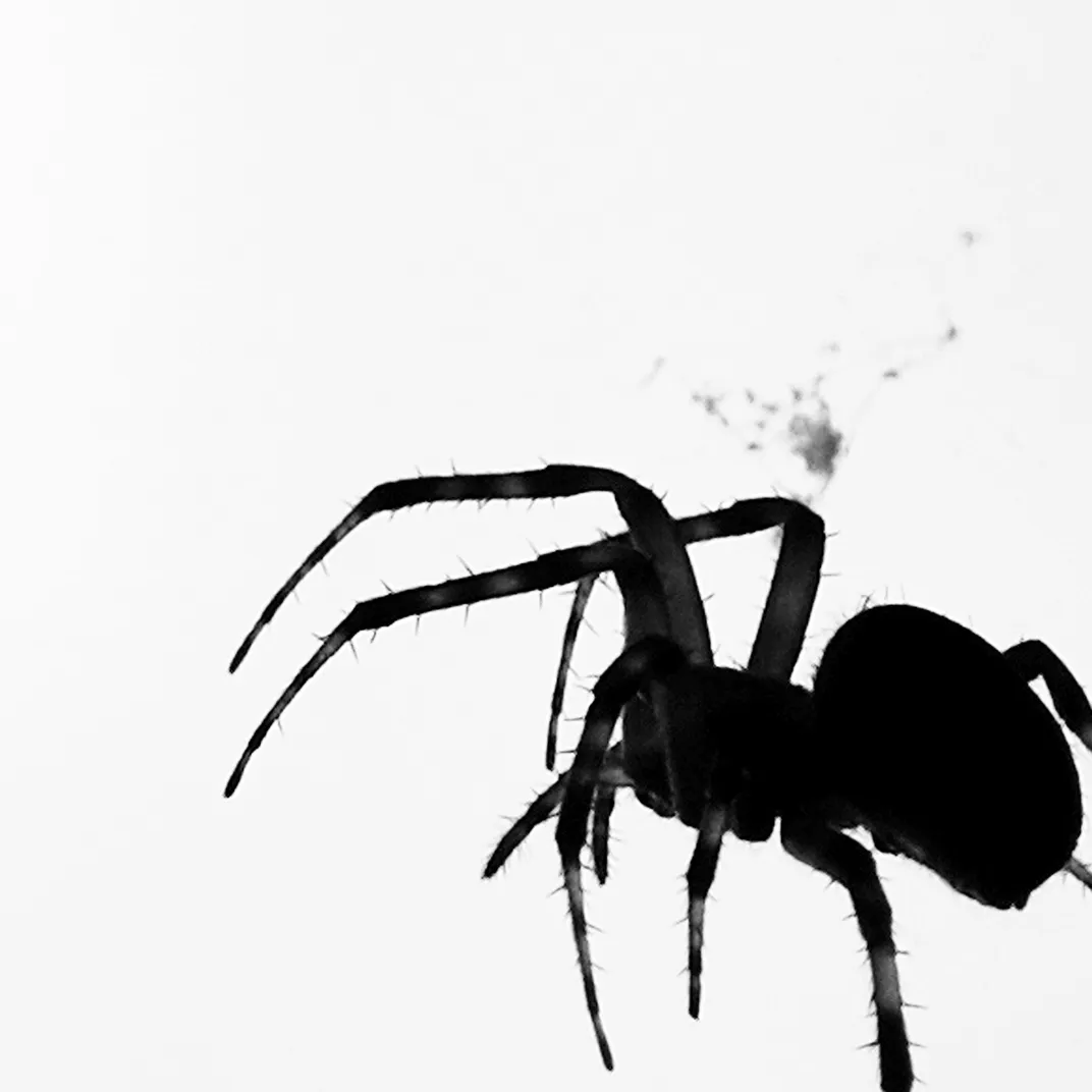 A spider over the grey sky outside a neighbor's house.
